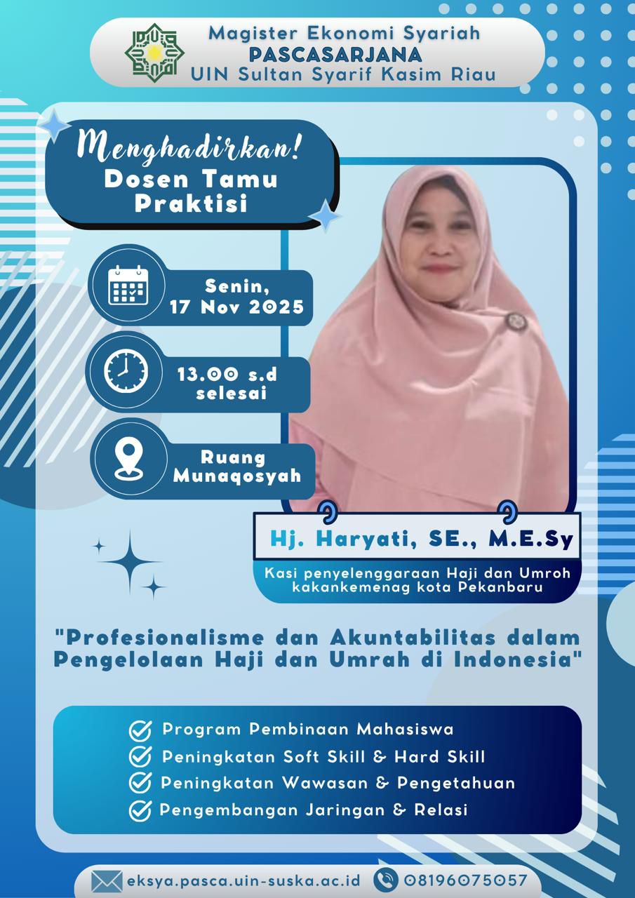 Pascasarjana UIN Sultan Syarif Kasim Riau melaksanakan kegiatan Pembinaan Kemahasiswaan dengan menghadirkan narasumber dari Kementerian Agama Kota Pekanbaru, Hj. Haryati, SE., M.E.Sy., Ak, Kepala Seksi Penyelenggaraan Haji dan Umrah. Kegiatan ini memberikan pemahaman mendalam kepada mahasiswa mengenai perkembangan terbaru terkait ekosistem ekonomi haji dan umrah—sebuah peluang strategis yang kini menjadi fokus transformasi nasional.